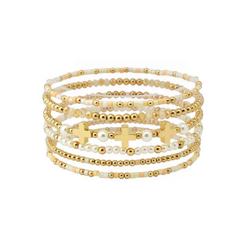 Set of 5 Gold Beaded with Natural Seed Bead and Gold Cross Stretch Bracelet