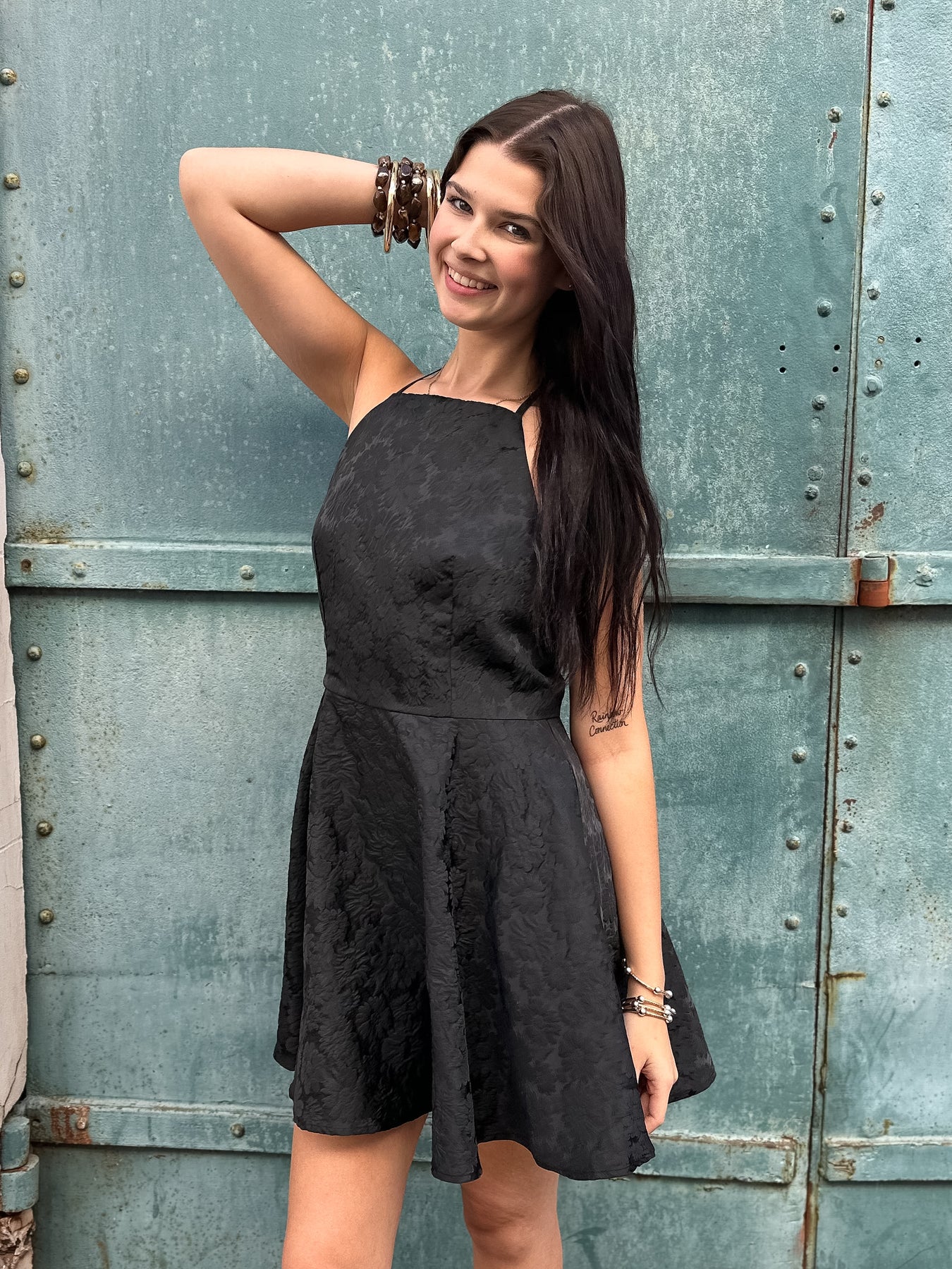 Details: • Halter neck design with back bow tie • Subtle floral detailing throughout • Flattering, flowy silhouette • Midi length for versatile styling