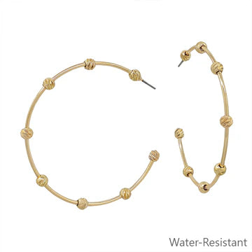 Water Resistant Gold Flat Beaded 2" Hoop Earring