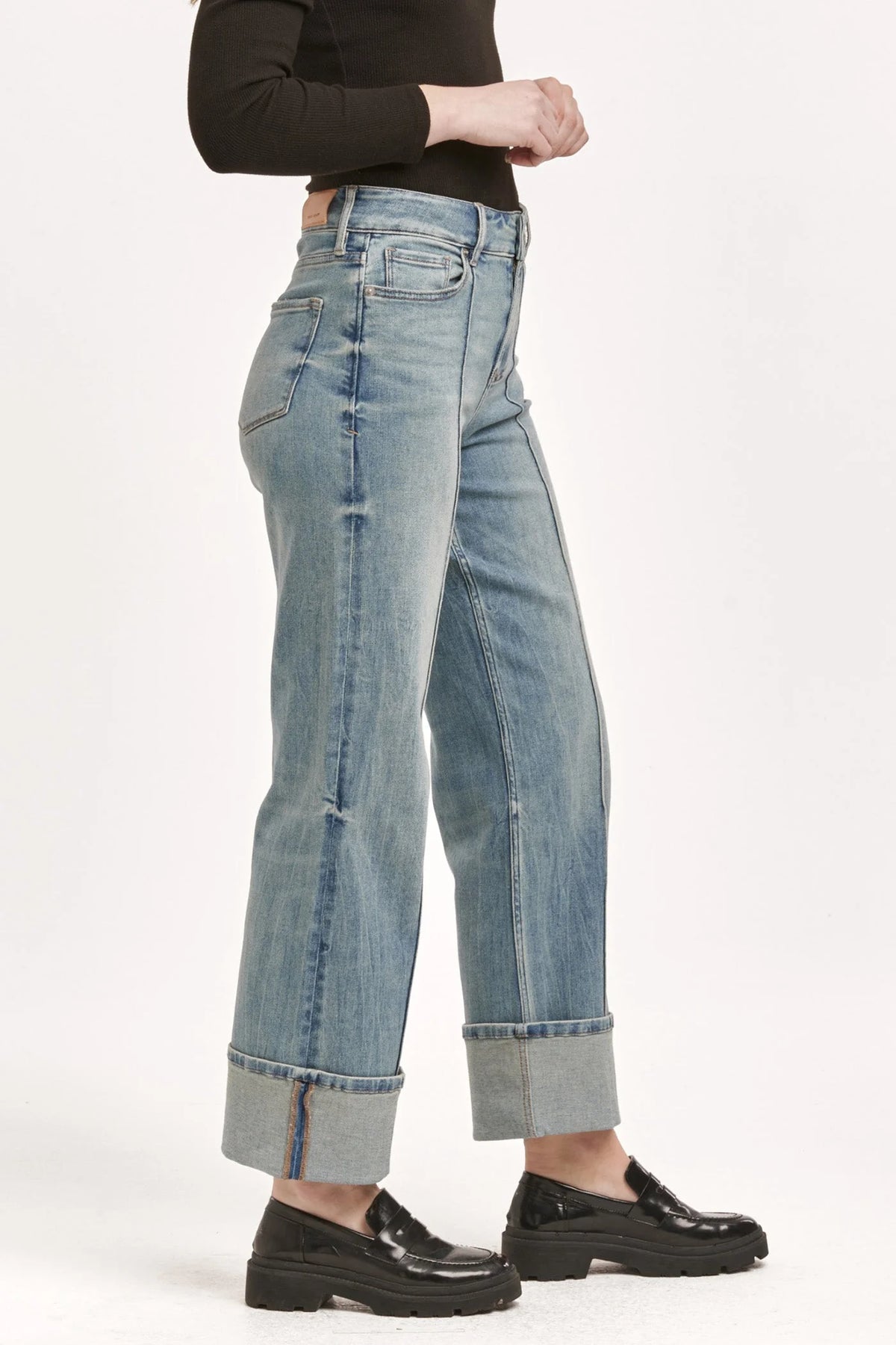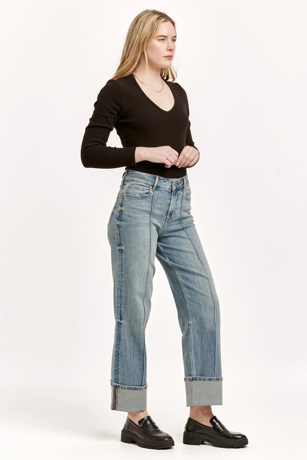 Super High Rise Straight Leg Jean – Pioneer Valley For a modern twist on a classic silhouette, the Pioneer Valley wash brings character to the Super High Rise Straight Leg Jean. Designed with precision, this style sits slightly lower on the waist and follows a straight, easy line from hip to mid-thigh. Featuring a cuffed inseam, pintuck front seams, hand-sanded whiskers, marbleized netting effect, and pocket grinding, Pioneer Valley offers a lived-in finish that feels effortlessly cool.