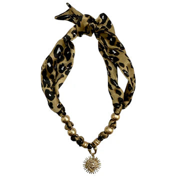 Cheetah Print Scarf Necklace with Gold Sunburst Charm