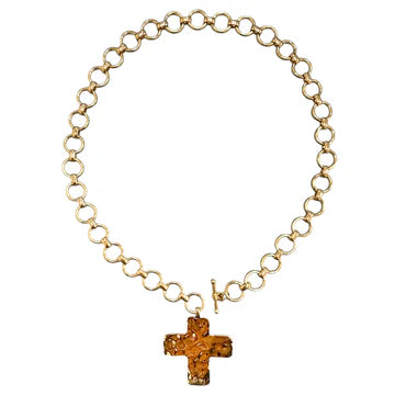 Shiny Gold Open Circle Toggle Chain with Hammered Gold Cross 17" Necklace