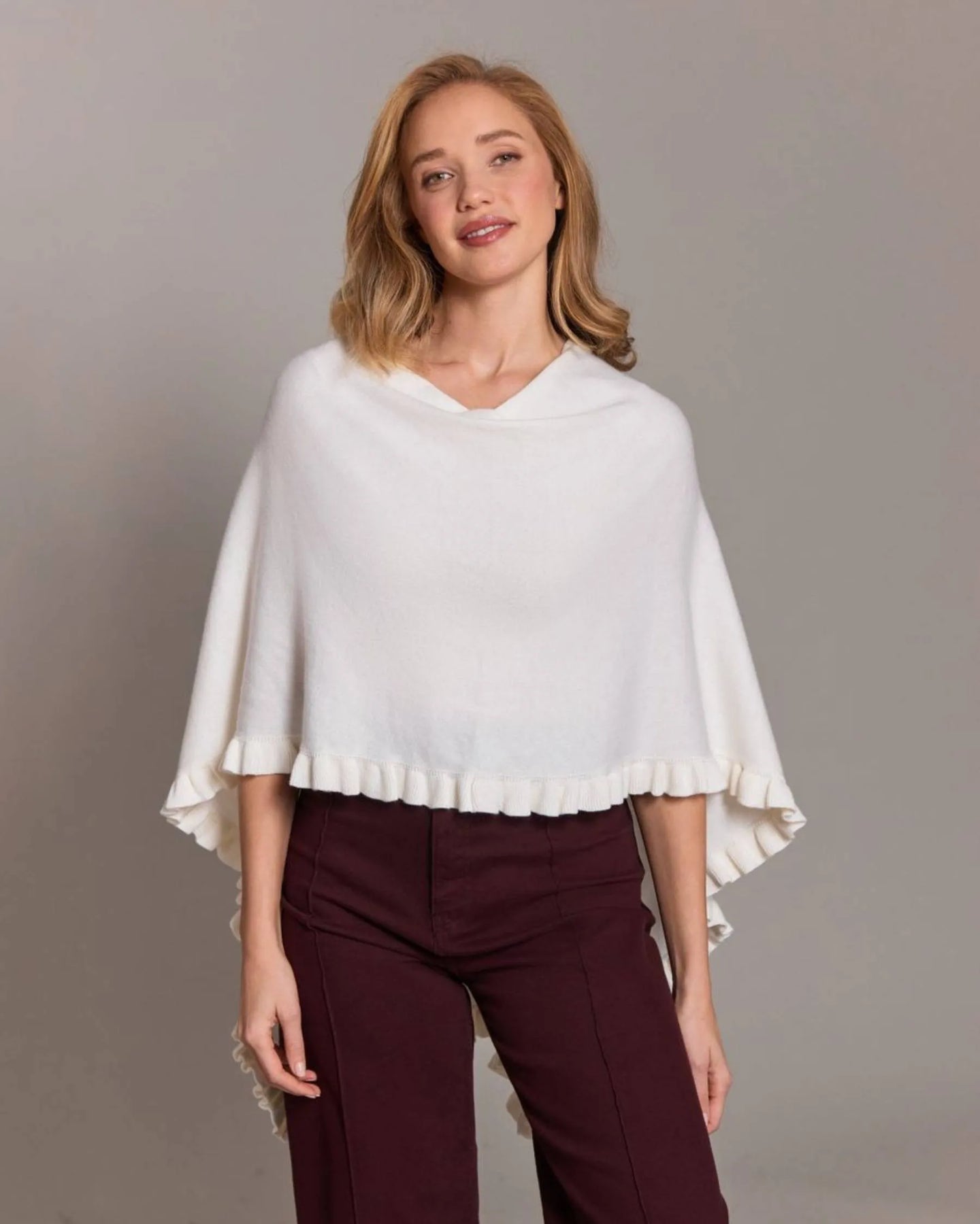 Details: • Light and soft cotton–cashmere blend for year-round wear • Mini ruffle edge for a subtle, feminine finish • Elbow-length opening with an easy, flattering drape • Multiple ways to style and layer • Body length: 20"