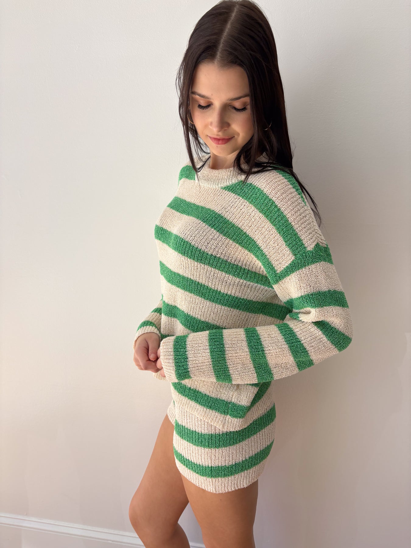 Description: The Green Sweater Set from Meet Me in Santorini is the perfect blend of cozy comfort and playful charm. Designed as a two-piece set, it features bold horizontal chunky green and white stripes that make a fresh, statement-worthy impression. The long sleeve, loose-fitting crew neck top offers an effortlessly relaxed feel, while the matching mini shorts add a flirty touch with their comfortable elastic waistband. Easy, elevated, and endlessly wearable, this set is made for lounging in style or stepping out with confidence.