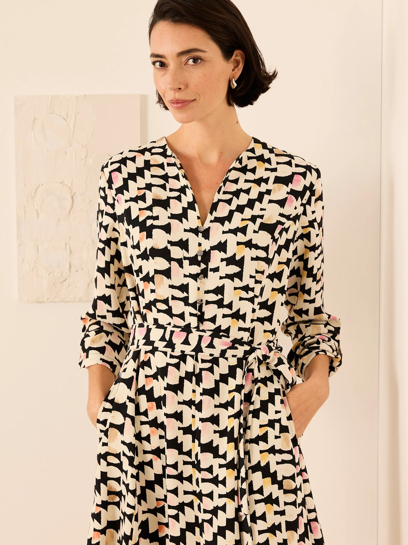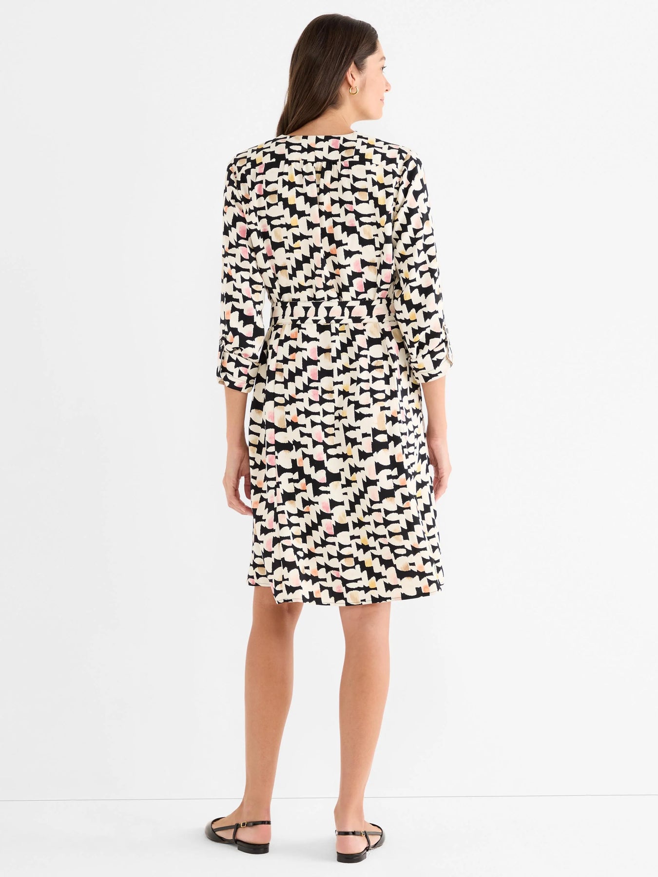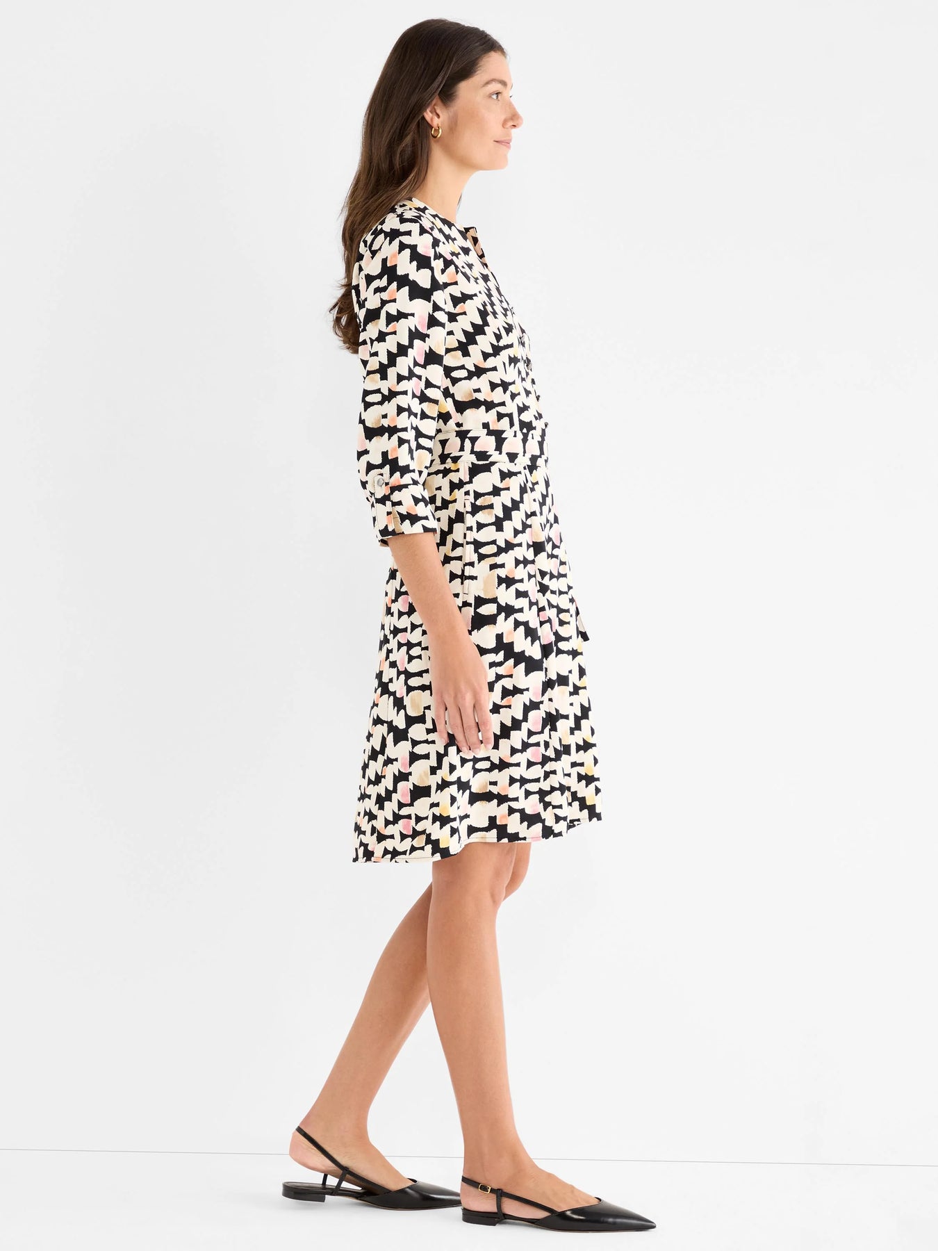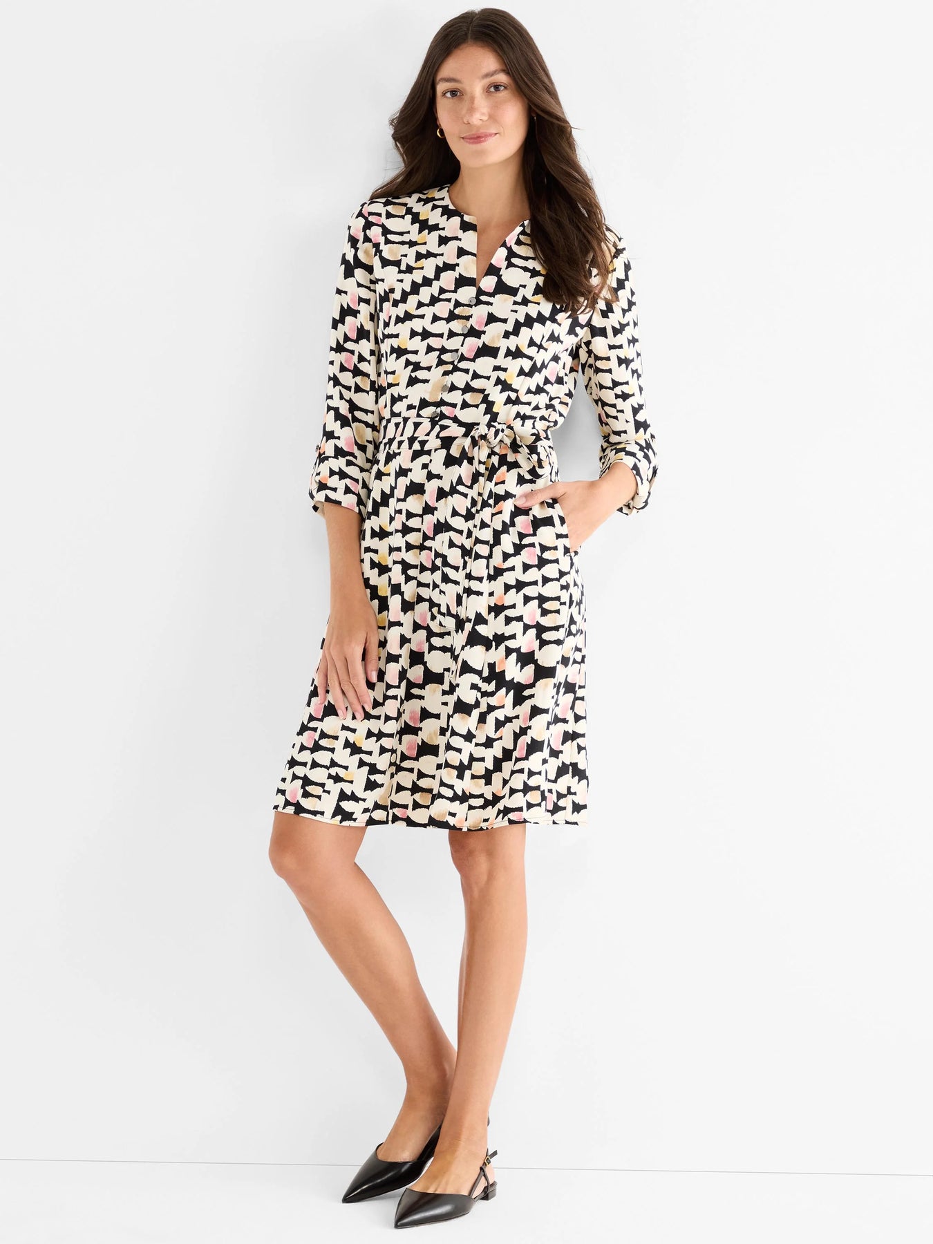 Description: Embrace retro-inspired style with the Mod Mix Zelda Dress. Featuring a shirting-inspired silhouette in a playful geo dot print, this dress is crafted from double crepe fabric to reduce sheerness while keeping a soft, drapey feel. A self-tie waist belt and adjustable sleeves let you personalize the fit, and convenient side seam pockets add effortless functionality. Pull it over the head for a polished, easy-to-wear look that falls just at the knee.