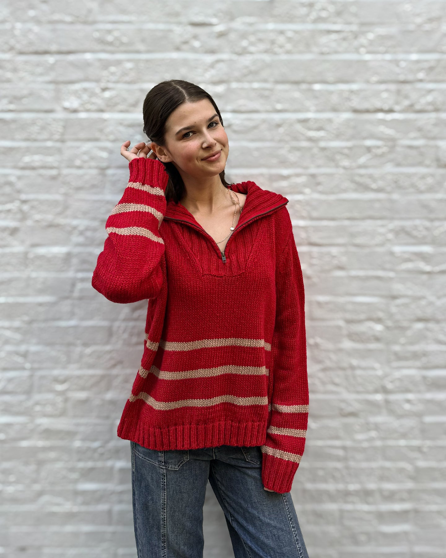 Description: The Petra Striped Zip Top – Chunky strikes the perfect balance between relaxed comfort and elevated style. Crafted from super-soft chunky yarn, this piece features a half zip collar and bold stripes for a statement look you can wear from laid-back weekends to casual evenings out. Whether you’re layering it with a coat for cooler days or wearing it solo, this top brings a fresh, modern edge to your wardrobe.
